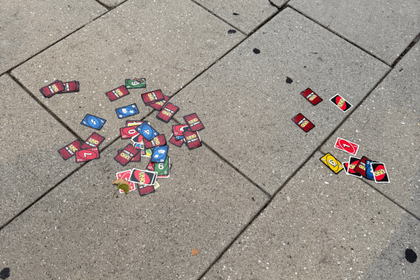 In addition to color, people interpret visual information using visual perception theories like bottom-up and top-down processes. Bottom-up relies on sensory input, including color, shape, contrast, and other features, while top-down channels prior context and knowledge to depict what we are seeing. This same image of the UNO cards uses the bottom-up visual perception theory by contrasting the bright card colors against the gray pavement. It’s also using the top-down theory since some viewers can interpret disarray from the cards left scattered everywhere.