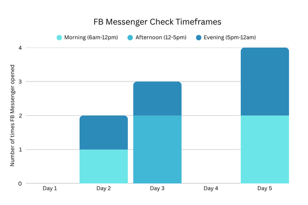 As seen in the two graphs pictured above, I checked Facebook Messenger on the second and the fifth day in the morning during this digital detox. Both mornings, I arrived at work around 9 am instead of 8:30 am and felt more fatigued earlier in the day.
